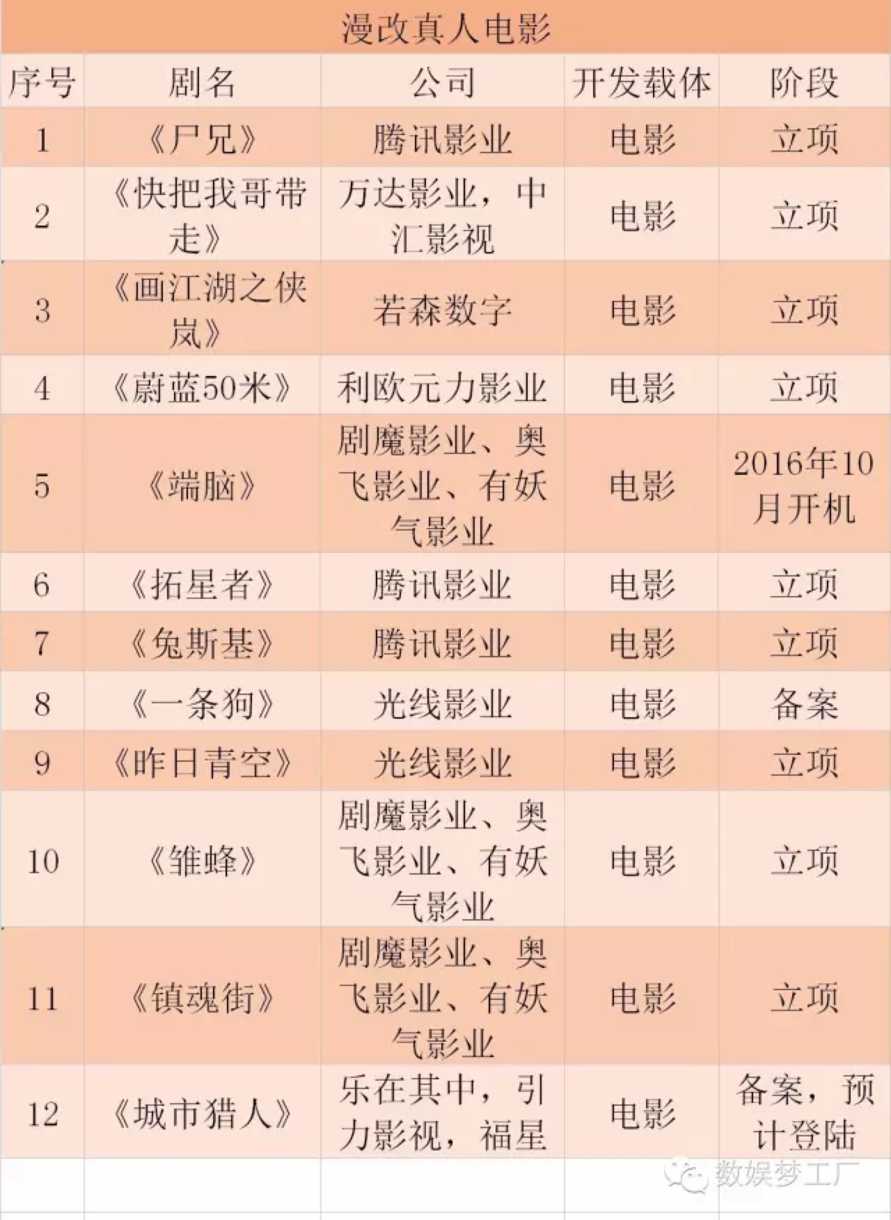 在目前签约开发的41个漫改真人项目中,有29部敲定了影视剧的开发计划,而计划开发的电影项目则有12部,分别是《拓星者》、《兔斯基》、《尸兄》、《一条狗》、《蔚蓝50米》、《昨日青空》、《快把我哥带走》、《端脑》、《雏蜂》、《镇魂街》、《画江湖之侠岚》和《城市猎人》。