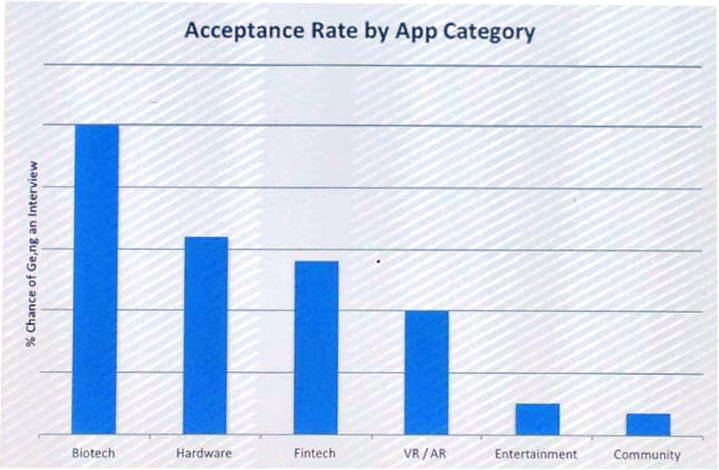 对比申请 YC 的创业项目总量和申请成功的数量,不难发现,做社区的创业者是最多的,但是做社区的创业项目申请成功的是最少的,生物科技则恰恰相反。