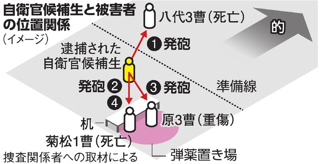 当天,18岁的自卫队后补官渡边直杜在参加射击考核的时候,对教官点射4枪,杀死2人、重伤1人。在上午9时30分左右,他被移交日本警方。
