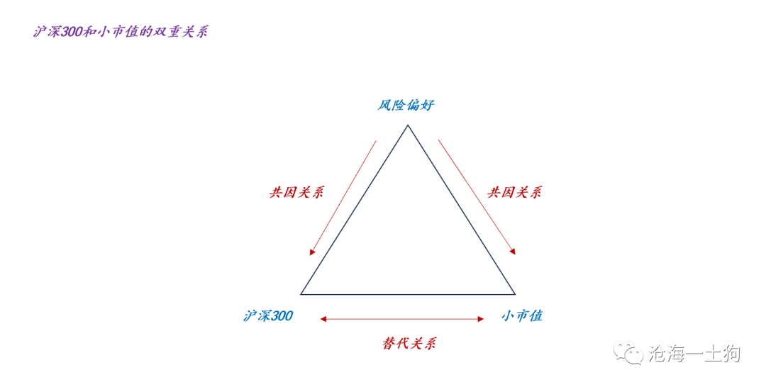 那么,为什么说这种三角关系普遍呢?事实上,沪深300指数和小市值指数也是一种三角关系,站在顶点上的是风险偏好。