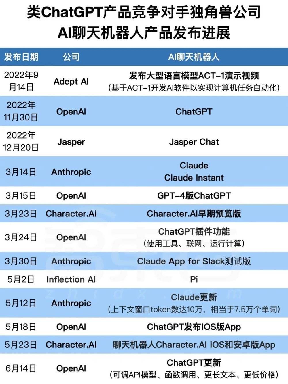 ▲类ChatGPT产品竞争对手独角兽公司AI聊天机器人产品发布进展