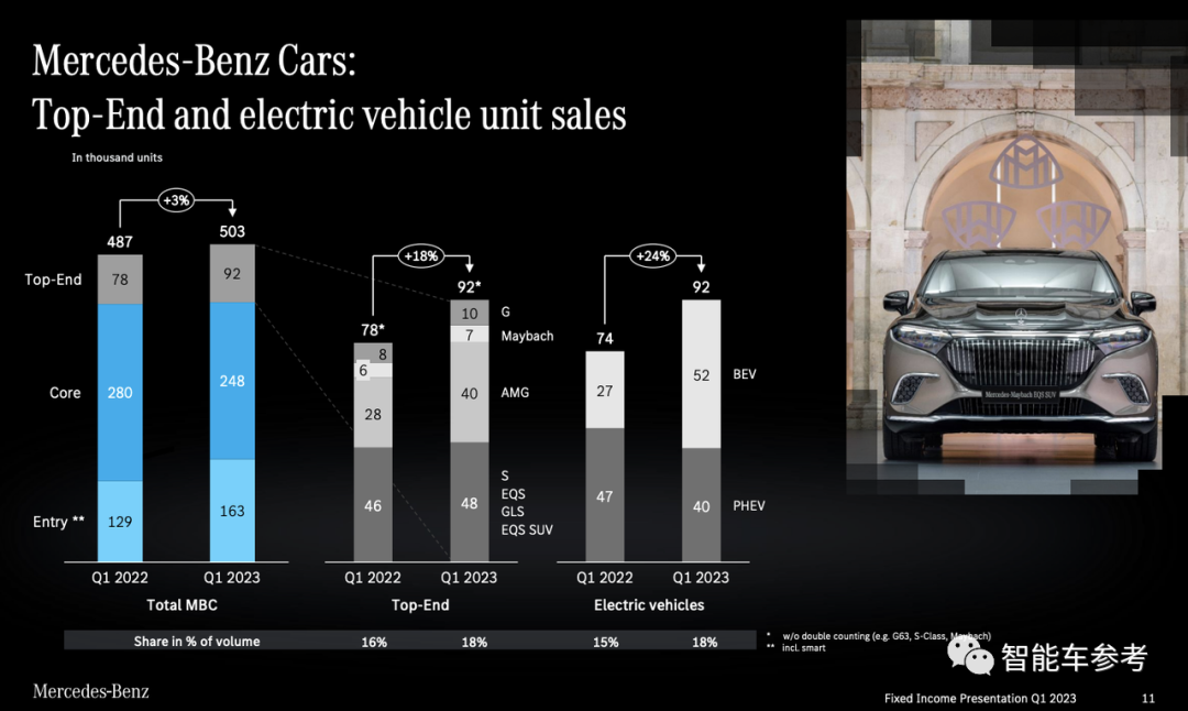 从销量上也能看出端倪,今年一季度,奔驰全球乘用车销量为50.35万辆,其中共售出9.2万辆新能源汽车(5.2万辆纯电车+4万辆插混车),仅占汽车总销量的18.27%。