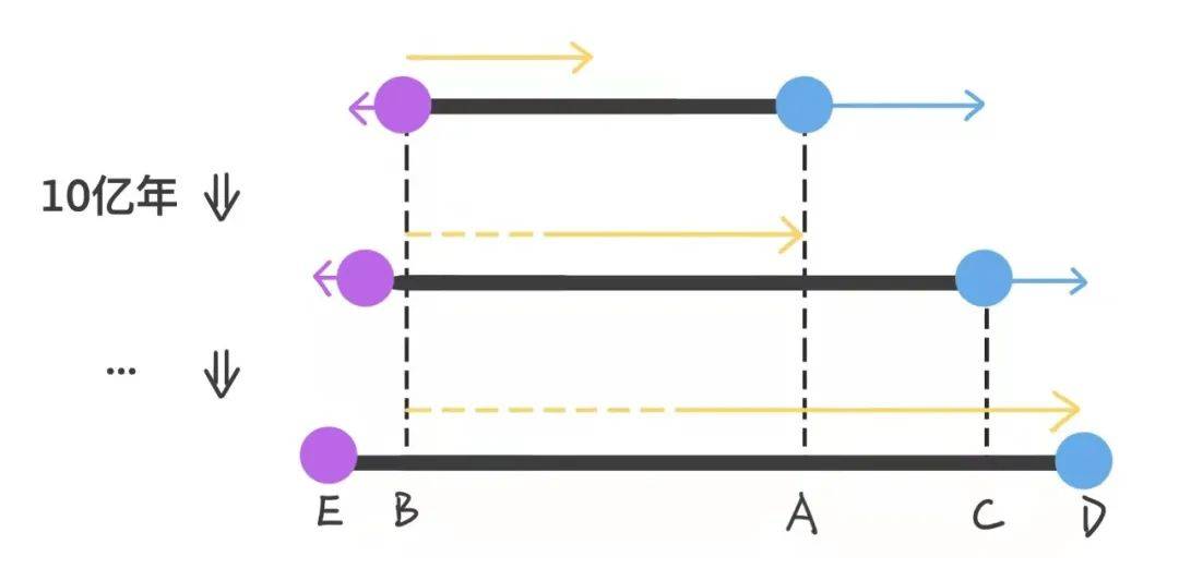 因此,即使地球和该星系保持静止,它们之间的距离也会因为宇宙空间的膨胀而逐渐增大。这意味着,光经过10亿年的时间后实际上只到达了地球原本所在的位置A。然而,在此期间,地球已经移动到了位置C。光继续追逐地球,直到在某个位置D追上地球。而与此同时,该星系因为宇宙空间的膨胀退行到达了点E。
