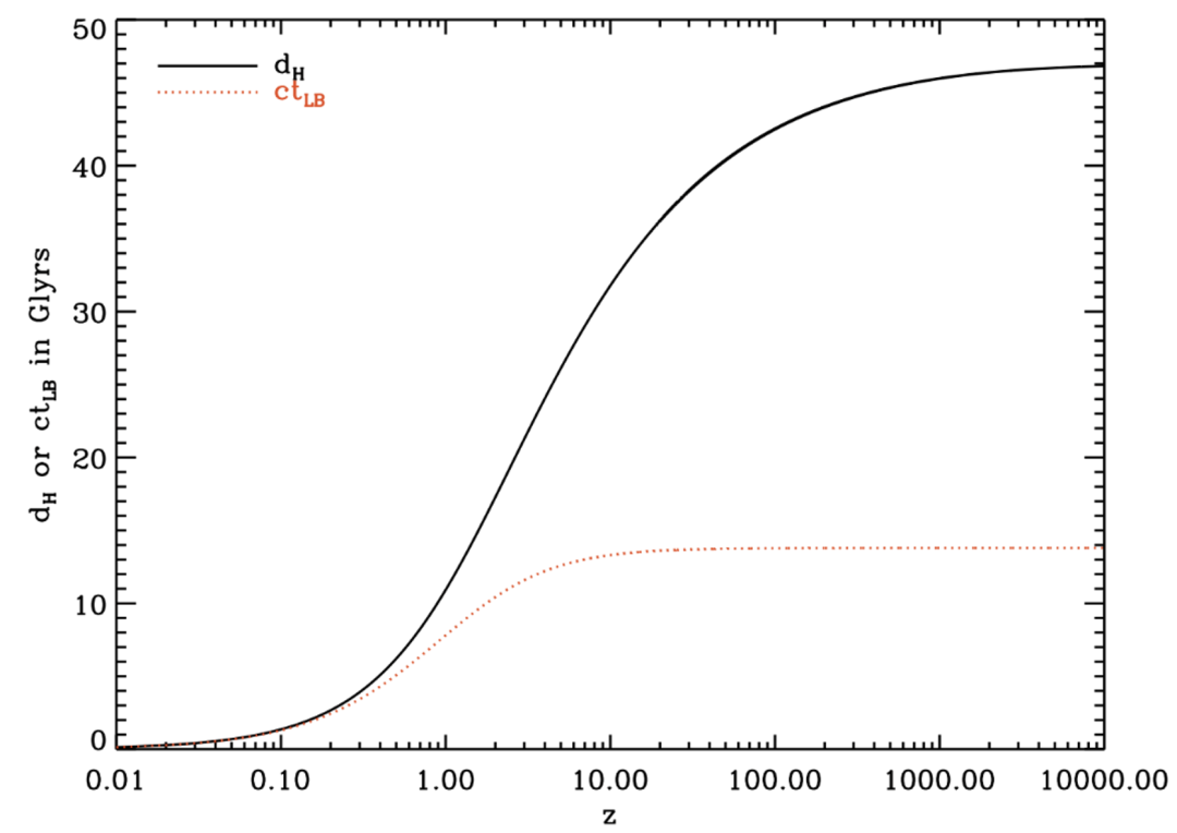 图3| 红移与共动距离之关系:纵轴为距离值(也可表示时间),单位为十亿光年;横轴为红移值。