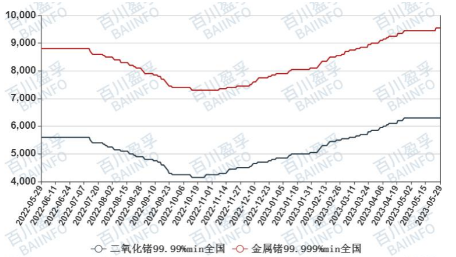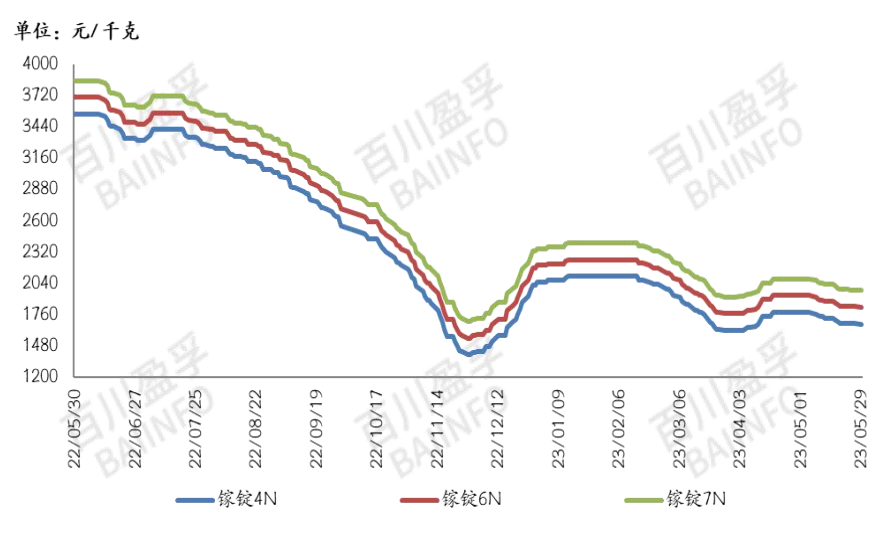 据百川盈孚的报告,5月末金属镓(4N)价格在1675元/千克,月均价在1718元/千克;高纯镓(6N)价格在1825元/千克,月均价在1868元/千克;高纯镓(7N)价格在1975元/千克,月均价在2018元/千克。5月末金属锗价格在9550元/公斤,月均价在9460元/公斤,二氧化锗价格在6300元/公斤,月均价在6300元/公斤,较上月末价格持平。