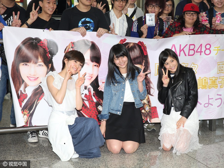 题图:2016年5月16日,香港,日本女子偶像组合AKB48成员小(山鸟)真子、冈田奈奈及西野未姬飞抵香港,准备傍晚到九龙湾展贸中心出席握手会,三位成员吸引大批男粉丝到场接机,粉丝更拉起偶像的巨型横额在接机大堂等候。