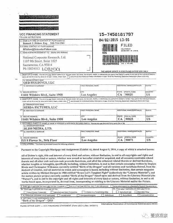 UCC-1文件登记办理是在与QED影业达成所谓的“投资协议”之后的8个月,而就在2015年2月,Bill Block(QED影业创始人,此前担任QED Holdings CEO)宣布离开QED Holdings,这个月的月末,麒麟终于知道了QED影业是一家李鬼公司,根本不拥有《Birth of the Dragon》的版权。