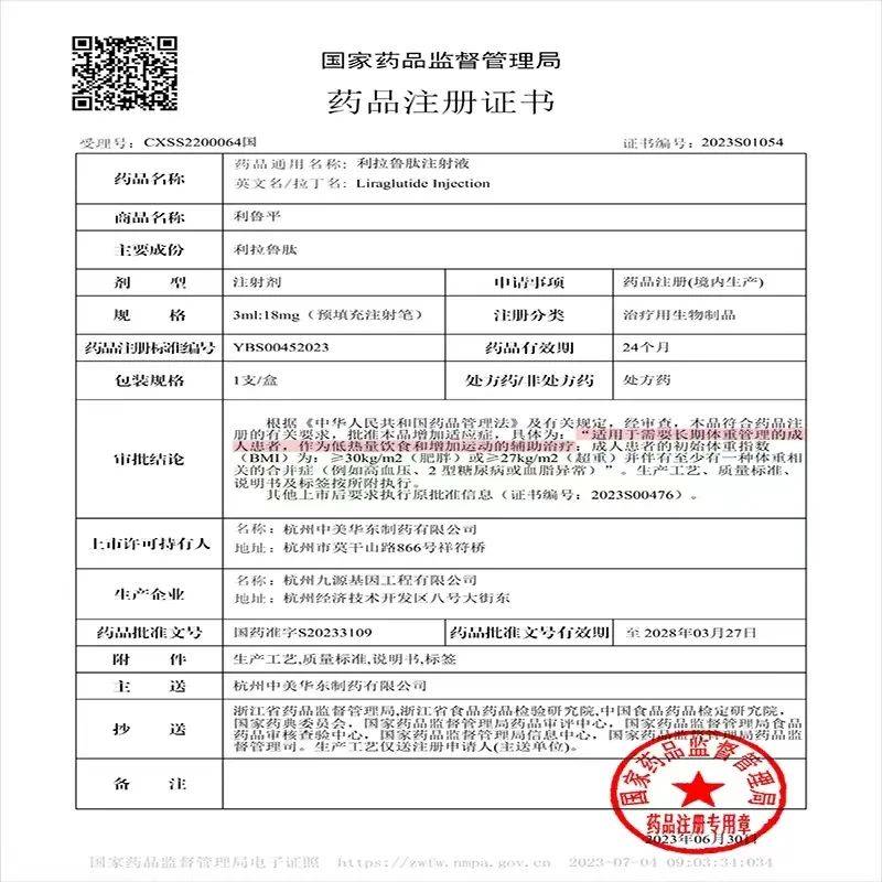 7月4日,华东医药(000963.SZ)全资子公司杭州中美华东制药有限公司(下称“中美华东”)收到国家药品监督管理局(NMPA)核准签发的《药品注册证书》,由中美华东申报的利拉鲁肽注射液(商品名称:利鲁平)肥胖或超重适应症的上市许可申请获得批准。
