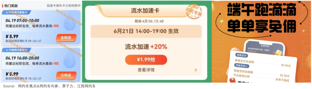可以看到,滴滴一边向司机兜售“彩票”——雨天膨胀卡、免佣卡、流水加速卡大范围推广。