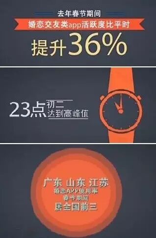 数据来说话,某手机消息推送技术服务商提供的大数据显示,去年春节期间婚恋交友类app活跃度比平时提升了36%,而且初二晚上23:00有较明显的提高,达到高峰值。