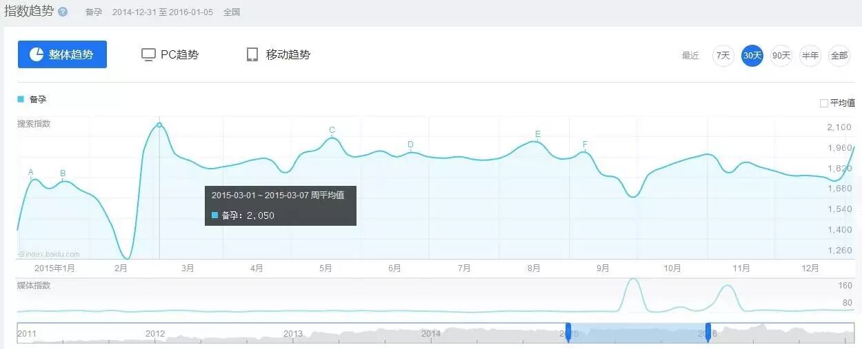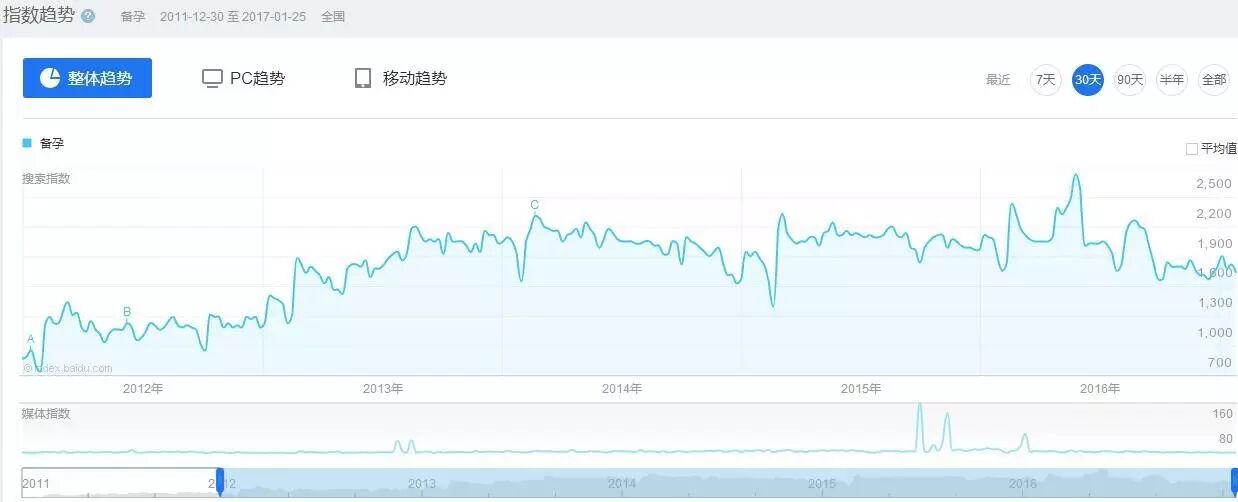 再来看数据。百度指数显示,从2012年到2015年,“备孕”这个关键词的搜索量每年从春节前一个星期持续到春节期间都呈现井喷式的增长,搜索量增长率几乎翻一番达到全年峰值。