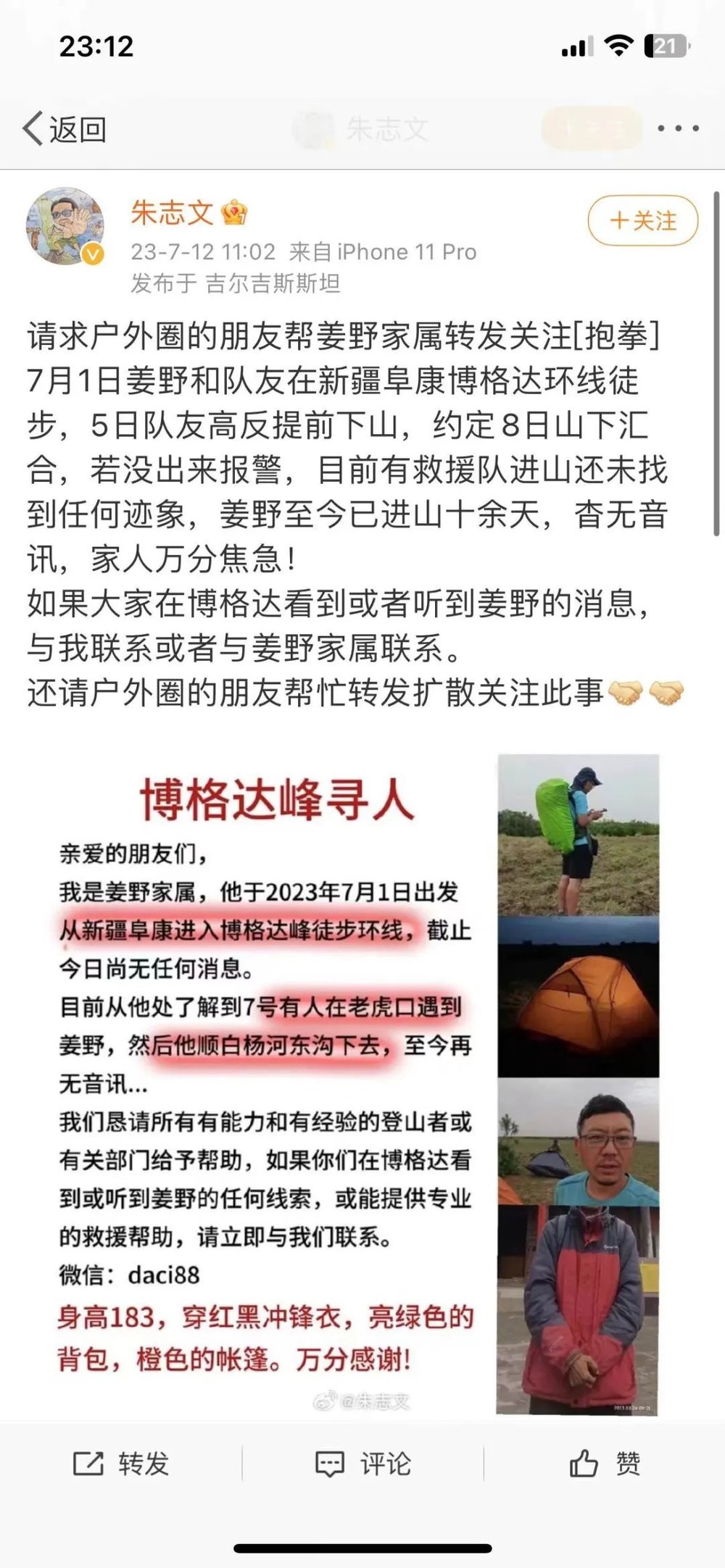 2023年7月1日,知名徒步爱好者姜野踏上了挑战徒步新疆博格达大环线的旅程,此前他还兴致勃勃地在自己的社交平台账号上与网友们分享前期的准备,谁也没想到这却是姜野在社交平台上留下的最后影像。