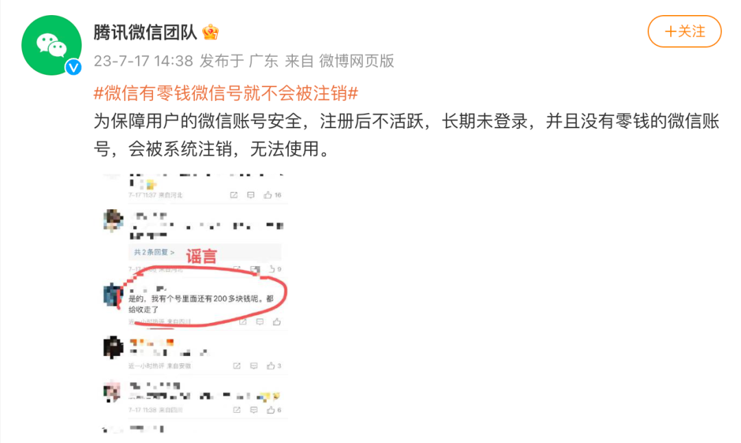 但这与“腾讯微信团队”在当天下午2时许通过官方微博发布的信息一致。“腾讯微信团队”微博表示,微信有零钱微信号就不会被注销,同步还附上一张照片圈出网友留言“有个账号还有200多元钱,还被回收”,称其为谣言。