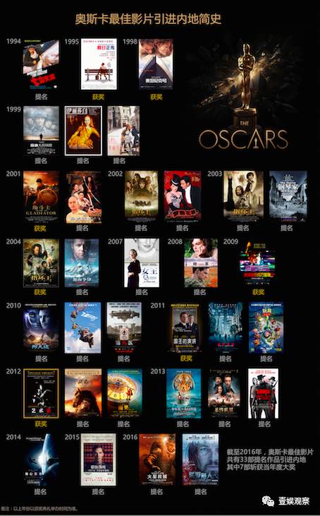 截至2016年,共有33部提名奥斯卡“最佳影片”的作品被引进内地,再加上今年已经上映的《爱乐之城》、《降临》和《血战钢锯岭》等3部影片,累计总票房接近58亿人民币。