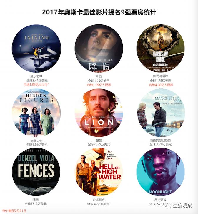 2017年奥斯卡颁奖在即,今年提名奥斯卡最佳影片的9部作品已经有三部登陆中国的大银幕——2月14日在中国内地起映的《爱乐之城》截至21日累积票房已达1.82亿,2016年末开画的《血战钢锯岭》和2017年初开画的《降临》分别拿下4.26亿和1.09亿。目前《爱乐之城》、《降临》和《血战钢锯岭》的全球票房也在提名的9部影片当中位列三甲,其中《爱乐之城》随着内地成绩的节节走高,有望冲击4亿美元的全球总票房大关,若如金球奖一样最终在奥斯卡颁奖礼上大丰收,则无疑将成为名利双收的最大赢家。
