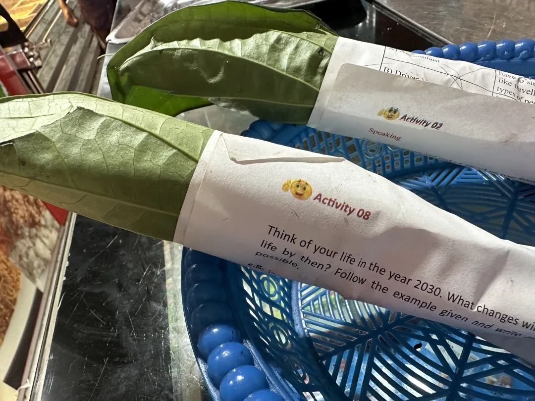 不久前,我还在街边餐厅遇到了用小孩子作业本包着的食物,节省被贯彻到了方方面面。