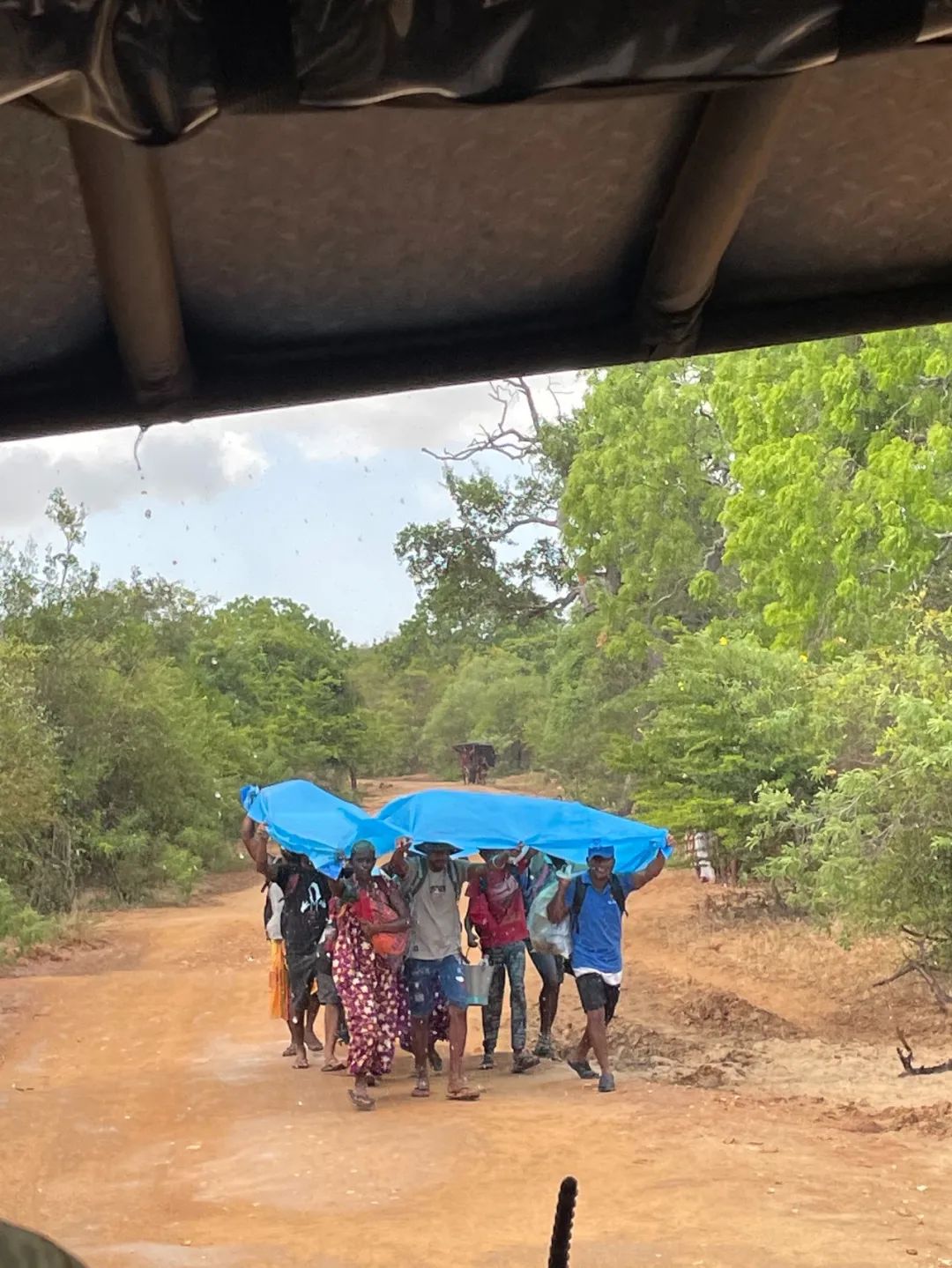 路途遥远,他们当然没有徒步鞋,大部分人穿拖鞋,甚至有人光脚。斯里兰卡人的“露营”,就是将一块塑料布垫在地上,直接睡觉,以天为被,以地为席。后来突然下起一场瓢泼大雨,大家便顶起雨棚——其实也就是晚上睡觉的垫子,继续前进。面对这个场面,向导的解说词是,苍天可怜他们太热了,于是给他们下了场雨。