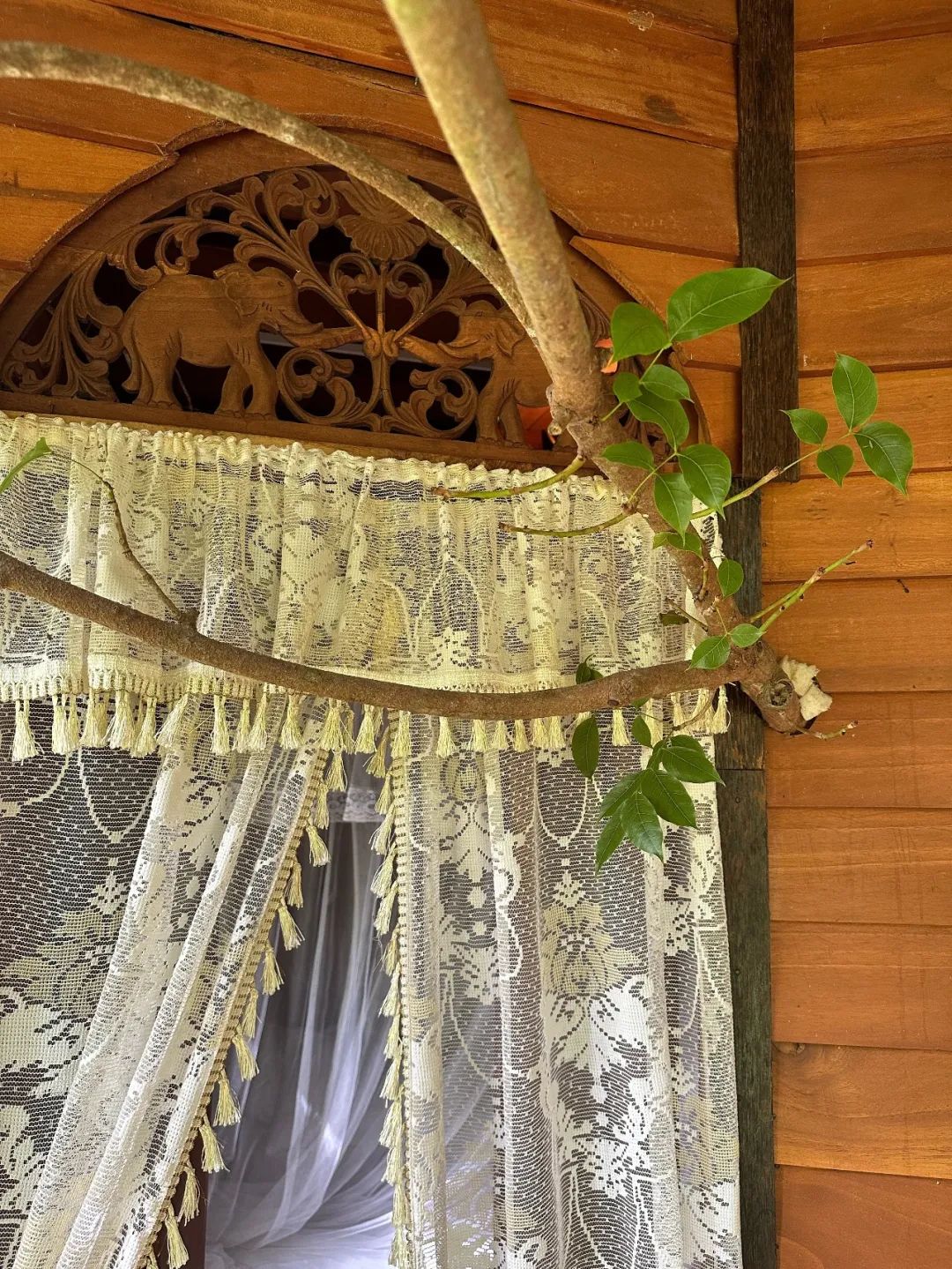 我住进了当地流行的“树屋”,整栋房子建造在一棵超过100岁的芒果树上,巨大的枝干从房屋穿过,晚上有萤火虫,早上有猴子。房东为我们四个人准备的早餐,包括了3种主食、6种水果、4种汤,摆满了一桌,看起来足够10个人吃,全是自己种植的。