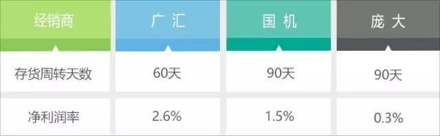 库存周转效率直接影响了经销商的净利润率,存货结转快,证明车辆销售收入在快速增长,而且存货资金占用在减少。广汇库存周转效率高于国机和庞大,因此净利润率也远高于国机和庞大。