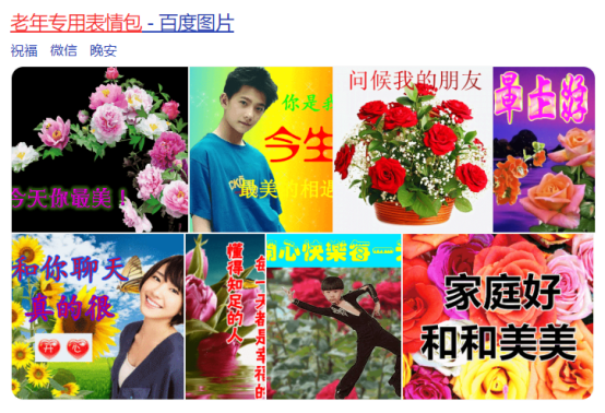 老年心理学的研究发现,老年人的记忆具有明显的“积极效应”,与年轻人相比,他们更容易注意到记忆中那些积极的信息。调查结果也证实,随着老年人认知功能的下降,情绪满意度反而上升,被称之为“老化悖论”,比如下面的专用表情包: