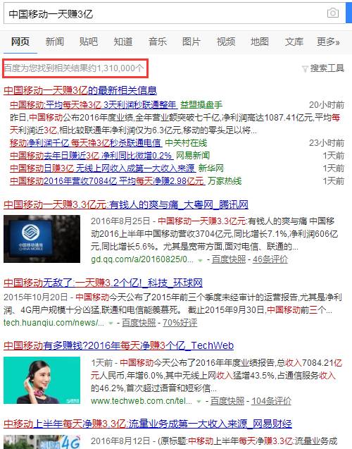 每年3月份,电信运营商会发布上一年度经营业绩。每到这个时候,只要中国移动发布年报后,业界和媒体对电信运营商的年度的分析或者解读,总是缺少不了中国移动一天净赚3个亿这道菜(从百度搜索相关信息结果高达131万个,2016年财报刚刚公布,每天挣3亿成为又是最近热炒的话题)。