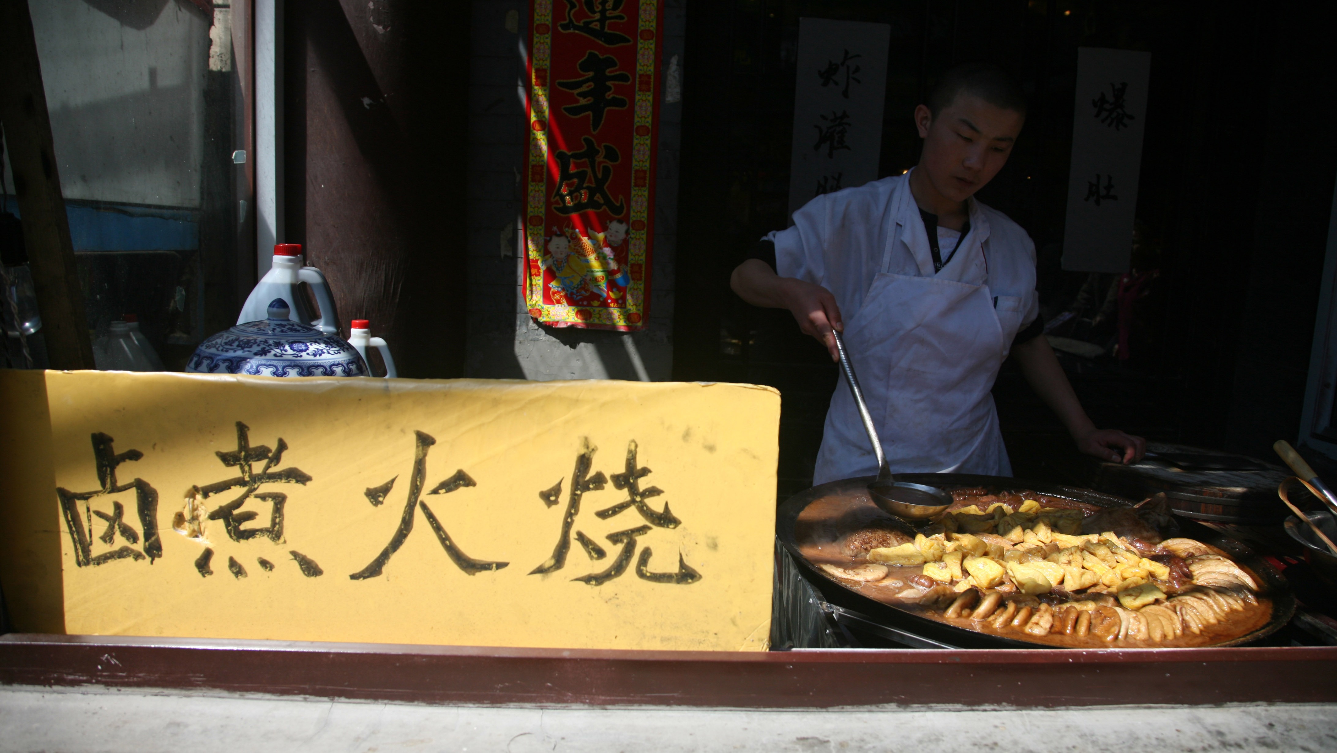 据说,乾隆皇帝下江南时,很喜欢一位苏州籍厨师的手艺,于是就把他带回紫禁城,专门在御膳房设立“苏灶局”。“苏灶”渐渐演化成“苏造”,也就有了“苏造肉”“苏造鱼”“苏造肘子”等。卤煮就是根据“苏造肉”的手艺,用小肠、肺头等下水代替猪肉做的。穷苦百姓把火烧放到锅里和小肠一起煮,再加上炸豆腐,既解馋又解饱。这一歪打正着,也体现了老北京的包容与豁达。