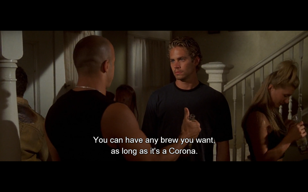 没有哪个品牌能在电影中如此招摇登场,连块盖头都不戴——除了科罗娜。而这种堂而皇之不但没有招致非议,还一直延续到了十四年后的《速 7》。记得吗?当时唐老大正要结果德卡特·肖的性命,中途却被无名氏警官截断。将唐老大强行带至自己的秘密巢穴后,这位警官本想奉上比利时啤酒,结果唐老大来了一句:“科罗娜才更对老子胃口。”