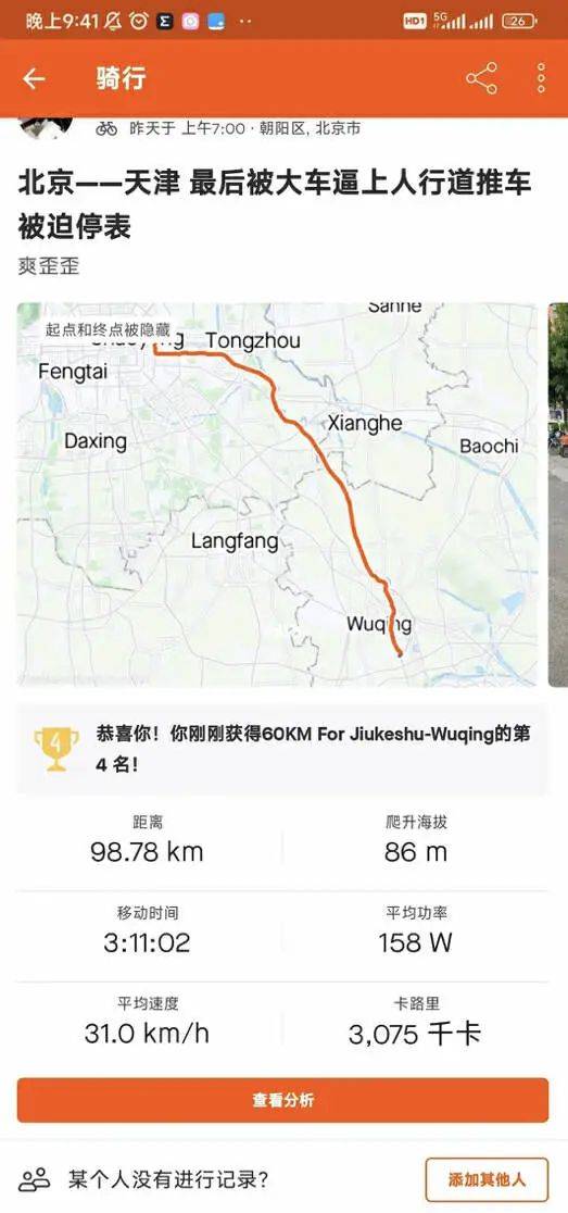 自从公路车替代飞盘,成为中产今年最流行的解压运动后,这条坐高铁半小时可达的京津线路被开发出了另外一种玩法——北京的骑行爱好者,纷纷踏上了这场里程相当于绕北京四环骑两圈的京津跨城苦旅。