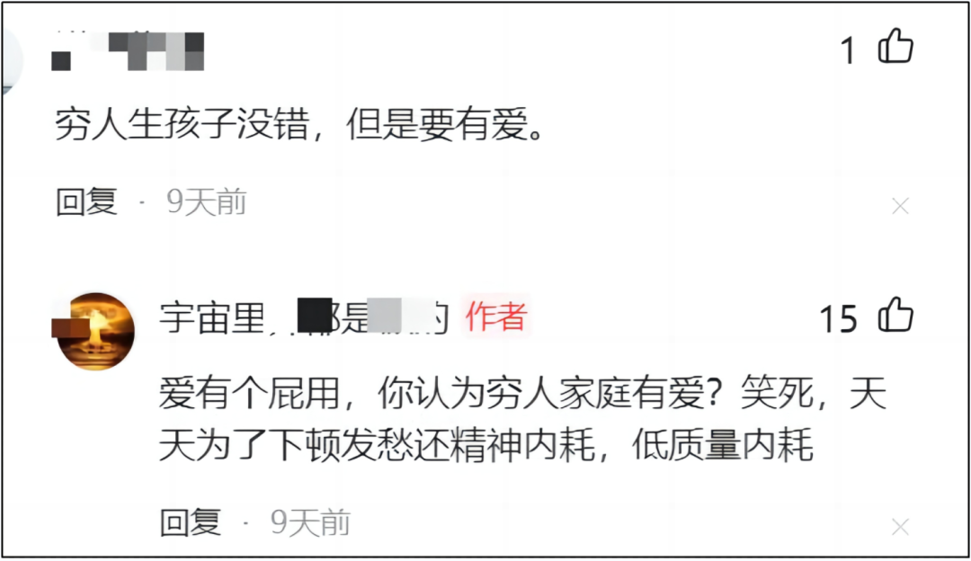 当然,更多时候大家表示穷人不配生娃,并不是真的想攻击穷人,只是表达自己的态度,怨恨自己的出身。