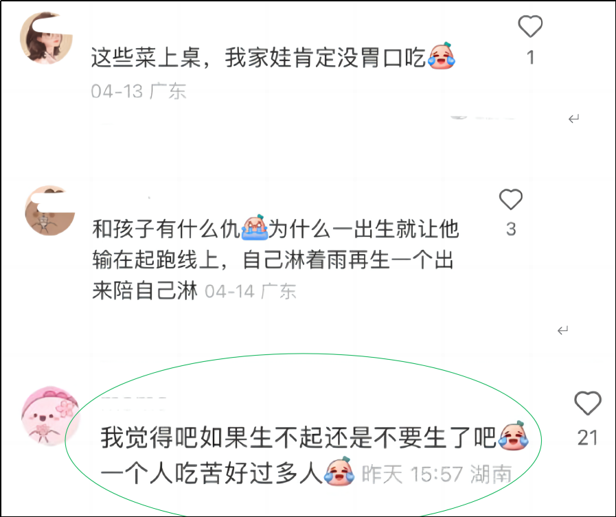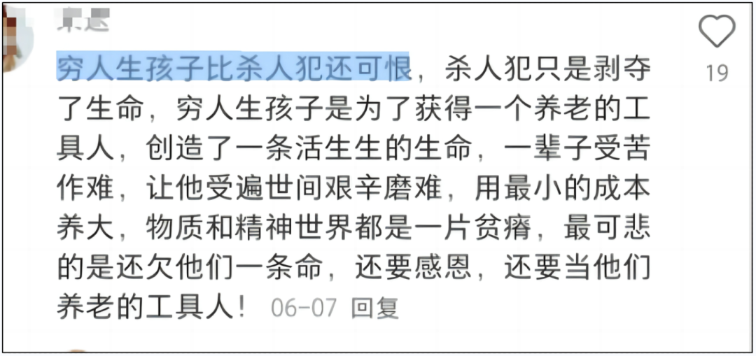 比如开头那个说“你穷还要生孩子,没法给孩子好的生活,孩子会恨你一辈子!”的网友,其实TA并不在乎别人的孩子恨不恨父母,但TA一定很恨自己父母没本事。