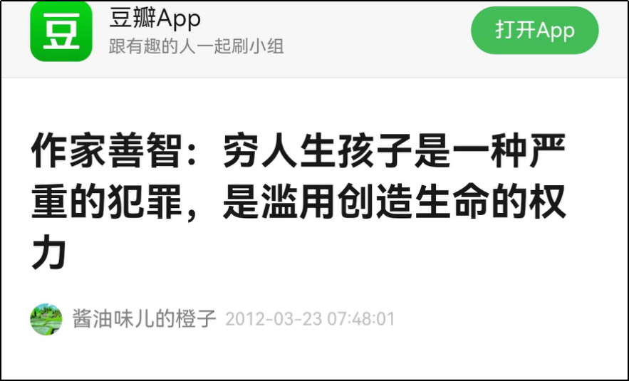 其实类似的观点也不新鲜了,十多年前豆瓣就已经有人写文表示穷人生娃是犯罪,只不过越来越多人同意了而已。