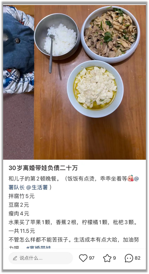 比如这个小红书博主,说自己赚得不多,除去房租等日常花销,每个月口袋里只剩600块。但还是在悉心照料着孩子,会记录每天花销。