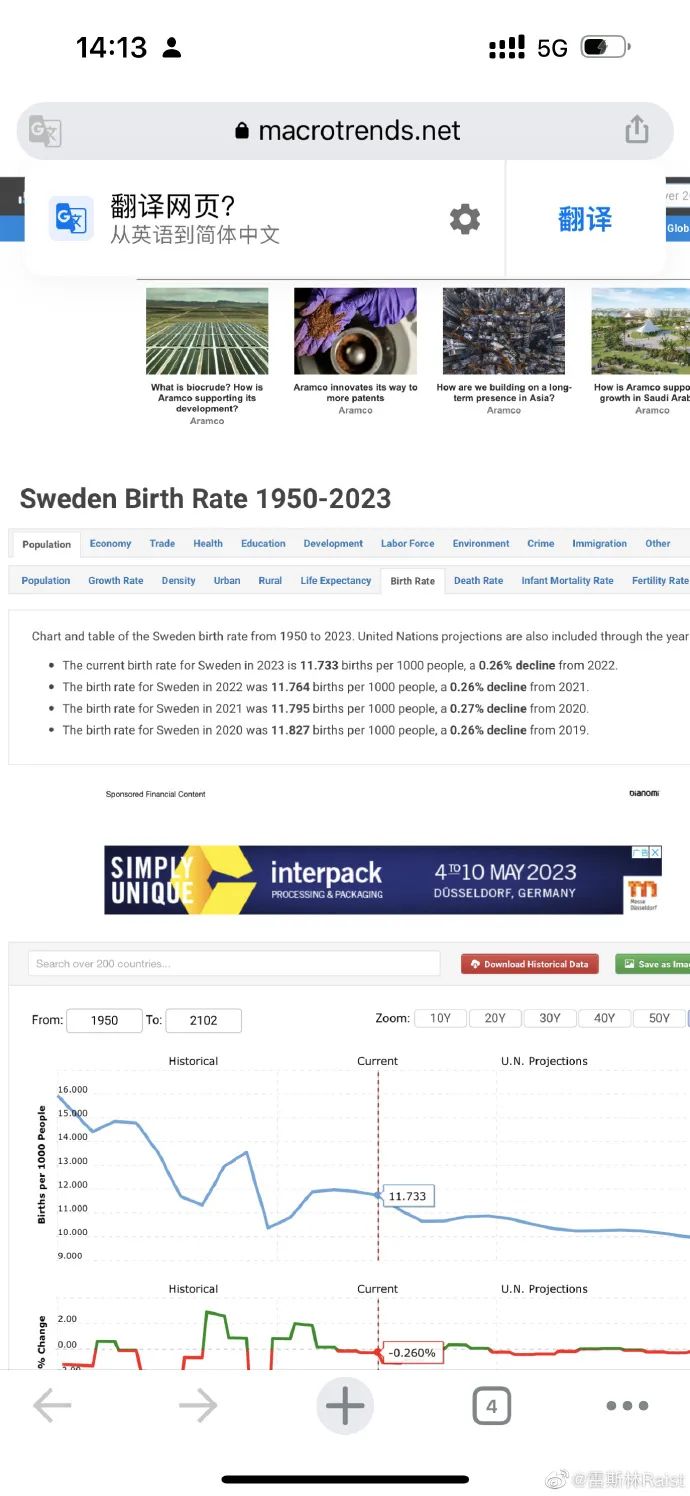 这种力度的补贴下,瑞典的生育率确实回升了。然而在短暂回升后,最近又连年下降,人口重新开始负增长。今年是瑞典17年来生育率最低的一年,联合国预测他们生育率未来只会一年比一年生育率低,依然比世代更替水平低一大截。