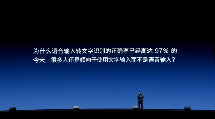 罗永浩说到用户为什么宁愿用纸和笔,宁愿用输入法而是语音输入法的时候,他变得严肃起来。开始抑扬顿挫,排比问句排山倒海。