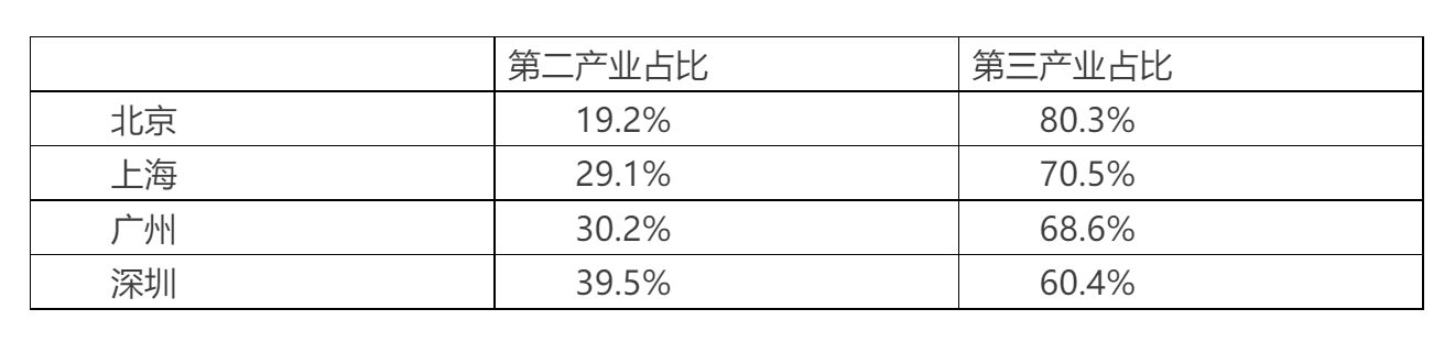 通过上述表格,我们可以看出四大城市的产业个性。北京是首都,全国的政治、科研、金融、交通、文化中心,服务业比例最高,工业占比最低,这个是合理的。上海是全国经济、金融、物流中心,服务业占比达到70.5%也未尝不可。