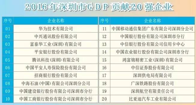 根据深圳统计局公布的数据,上述20家企业创造的GDP占了深圳全市的30%。其中华为、富士康、中兴通讯、比亚迪等上榜的7家工业类企业创造的GDP为2866亿元,占20强的55.4%。