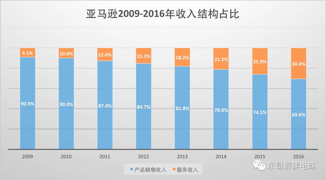 当然,开展新业务并不能迅速马上提升收入。改善毛利润率,需要三五年,甚至更长以上时间。在2011年前,亚马逊商品零售的收入占比依然高达90%。