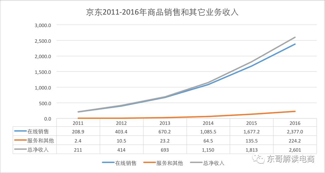 亚马逊除了在1997-2000年增速高于60%,此后大部分的增速都低于40%,一般在20-30%之间。而京东从2004年到2016年,连续13年时间,增速还没有低于40%的。