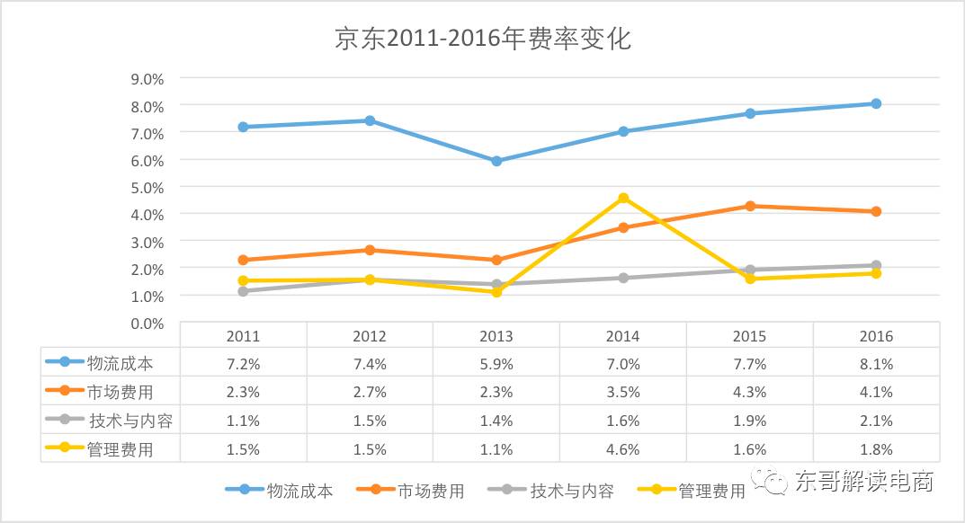 当然,随之而来的一个现象是,京东履约费用率大幅提升,从2013年的5.9%到最高8.44%。这同样是因为品类调整的直接结果,假设京东履约费用为10元每单,手机客单价是1000块,履约费用率只有1%。而日用百货/快消品的客单价只有150元不到,而且每单的履约费用在15元以上,所以履约费用率变成了10%。