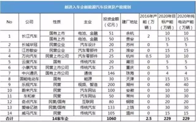 截止2016年底,已有14家新兴车企的投资规划和产能规划,截止到2020年,将会有增加229万辆的新能源车辆的产能,总投资金额为1060亿元。