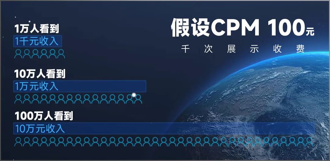 你在一篇文章里插入一条展示广告。展示广告,是按CPM(千次展示收费)计价的。假如CPM是100元。那么这篇文章(的内含广告)被1万人看到,就有1000元收入。被10万人看到,1万元收入。被100万人看到呢?10万元。