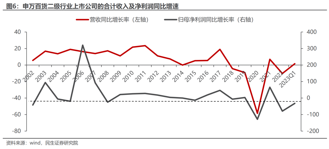 据民生证券统计,在电商行业的冲击下,自2011年开始,申万百货二级行业上市公司的合计收入及净利润同比增速开始下降。