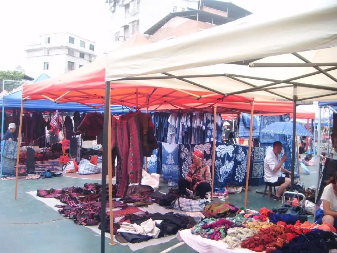 穿过很多小而纵深的店面,那些“xx西南民族服装批发”的店铺都像是仓库一般,深不可测,里面杂乱地堆满了从各地收来的绣品、织锦和挂毯。它们是固定营业的店铺,而散户们在每周四五中午之后就会离开。