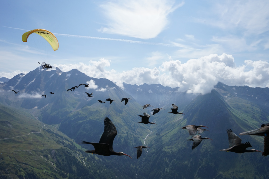 养母会不断呼唤鸟儿们,鼓励它们跟随|Waldrappteam
