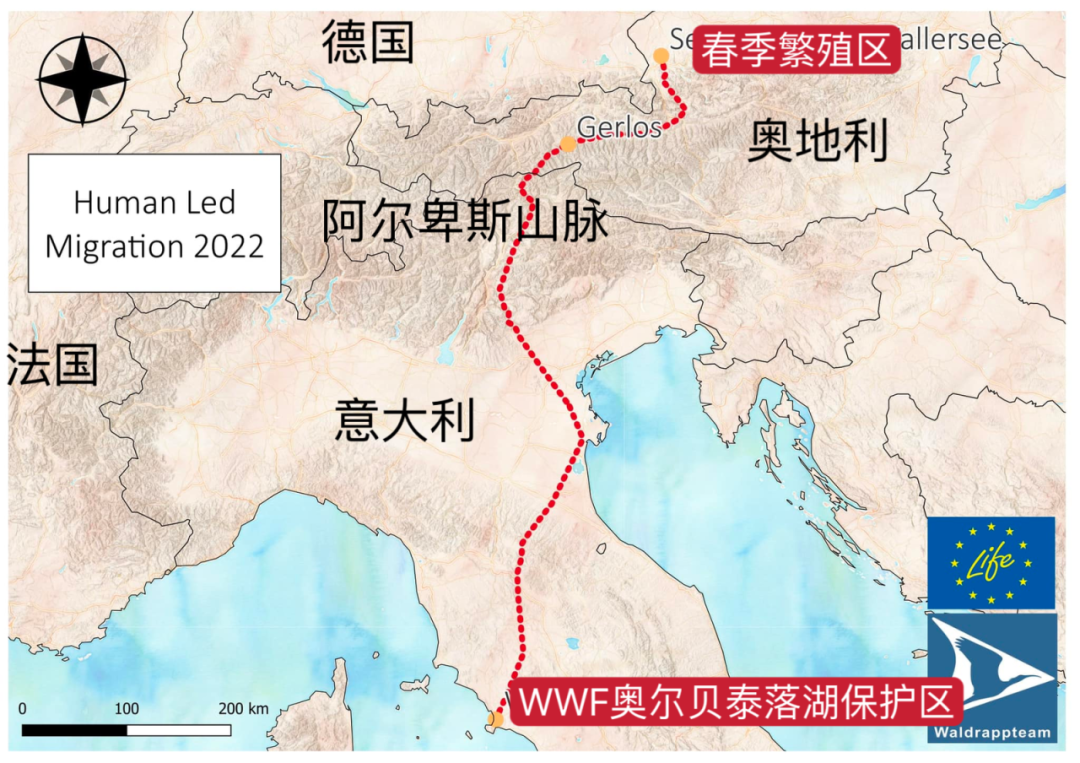团队每年都会带领隐鹮从阿尔卑斯山北部的春季繁殖地出发,向南飞往越冬区——位于意大利托斯卡纳南部的奥尔贝泰洛湖保护区,隐鹮就在这里被放归。