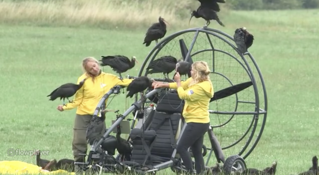 不论是隐鹮还是其他鸟类,都不会平白无故跟着飞机和人飞。想要让鸟儿加入并跟随飞行,需要很多前期训练与准备。在过去的十几年里, Waldrapp团队也不断优化隐鹮的繁育流程、改进飞机设备以及飞行技术。