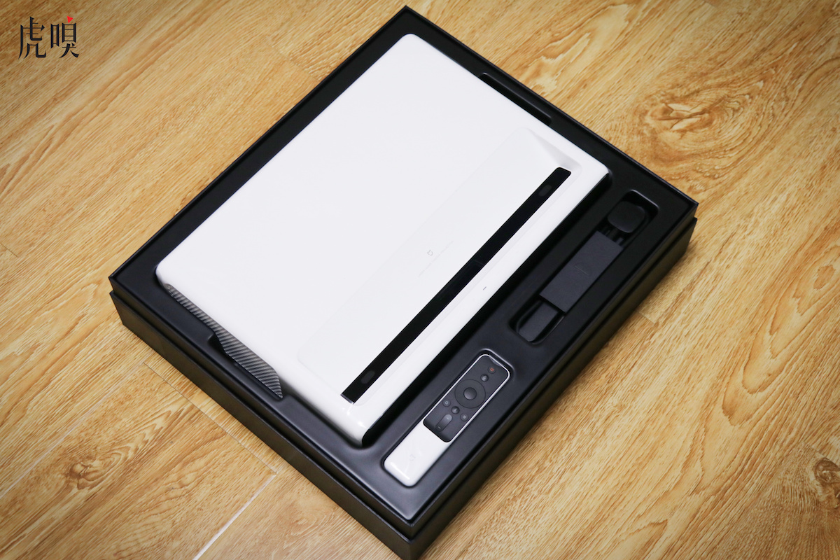 包装内产品很简单,激光电视主体、遥控器和一根电源线。如果你不需要有线外接其他设备,激光电视的布线将会格外简单:摆好投影,连接上电源,开机就行。