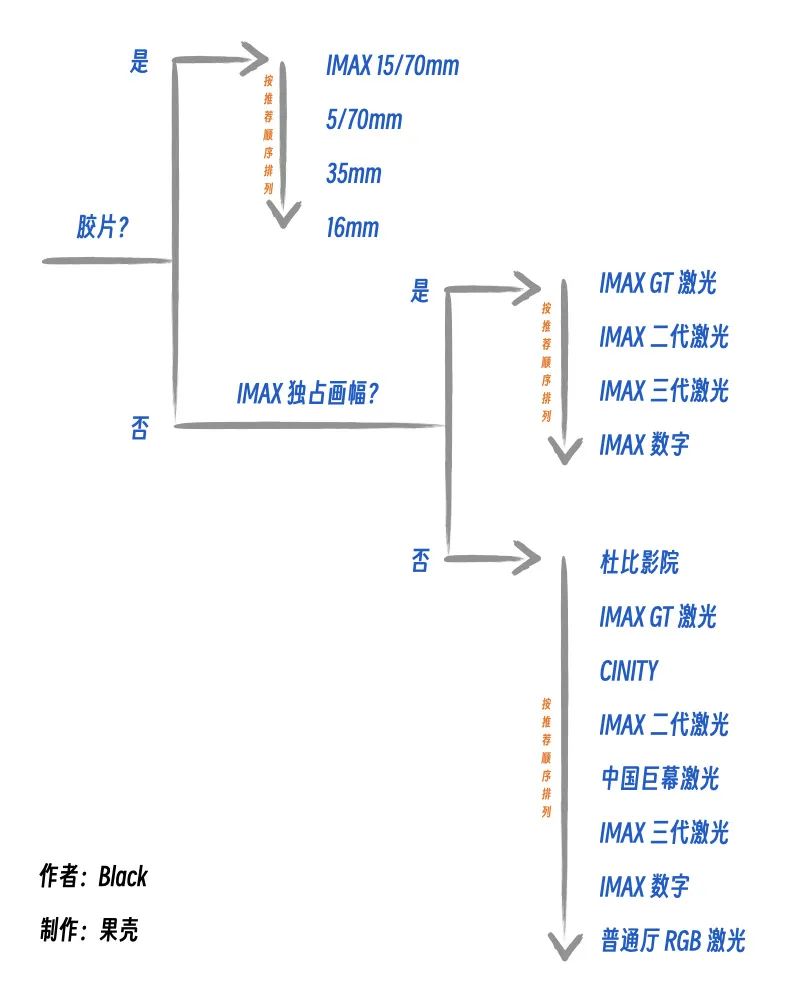 次之的选择顺序依次为:IMAX 二代激光、中国巨幕激光、IMAX 三代激光、IMAX 数字、院线巨幕系统、普通厅 RGB 激光和普通厅。