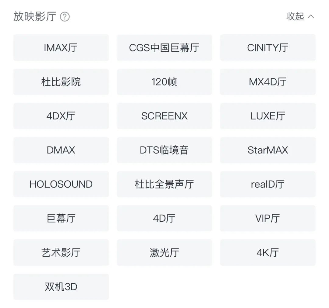 A:首先,这些标签并非完全并列关系,比如“巨幕厅”,就是个比较宽泛的标签,例如 IMAX 和中国巨幕等都算是巨幕厅。这些标题有品牌名称、设备指标,也有影厅规格。在我看来,它们更多是商业运作性质的关键词,是提取出来的“卖点”,观众很容易挑花眼。