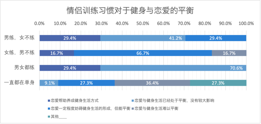 而双方都练的“健身情侣”有着相近的目标和动力,0阻碍率和30%认为恋爱为提供健身buff都足以说明,他们是恋爱与健身的最大赢家。